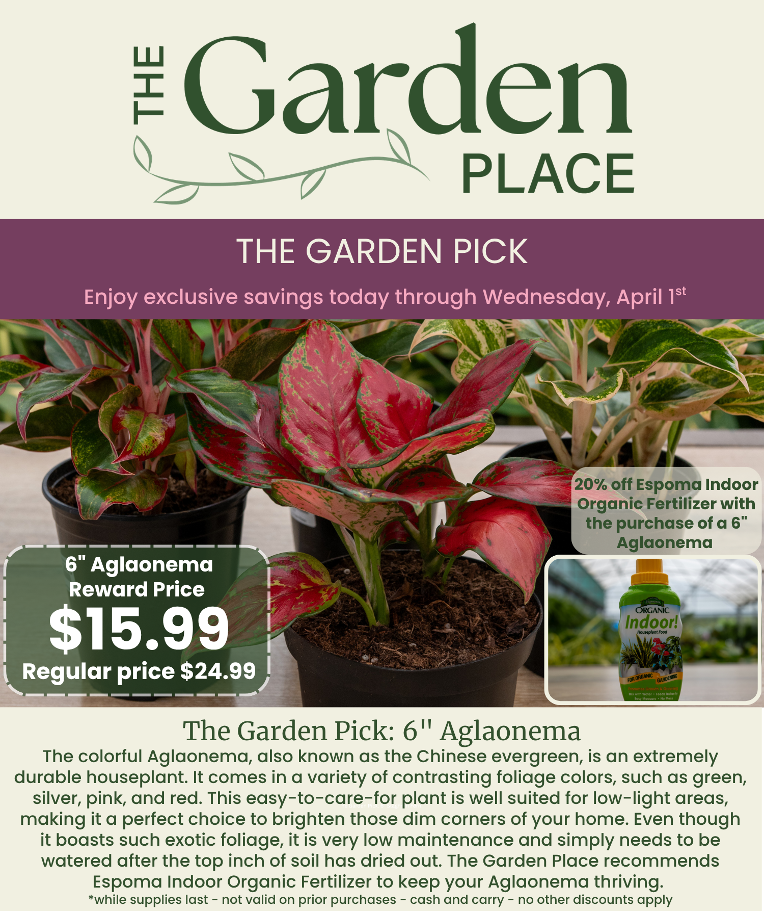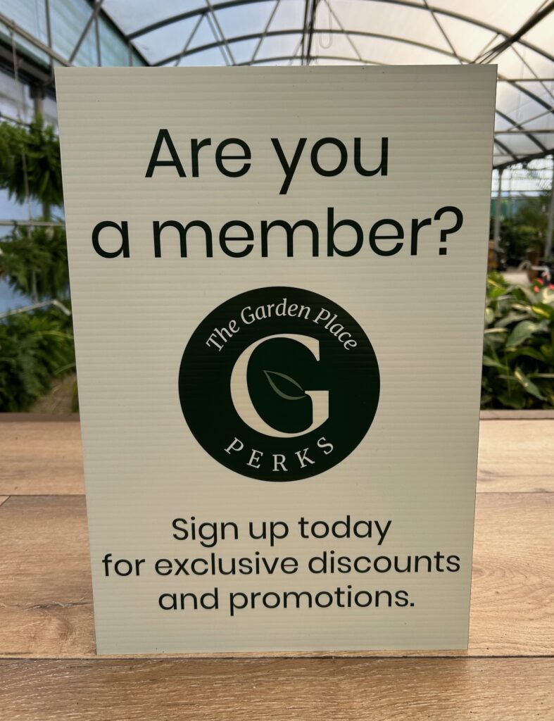 We love to help our customers save at The Garden Place. Check here for special promotions, including seasonal sales and holiday events, as well as The Garden Pick. Are you a member of The Garden Place Perks rewards program? If not, sign up for free today and start earning points on your purchases while gaining access to exclusive discounts.